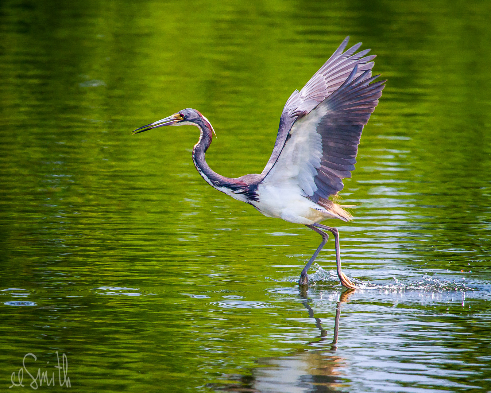 juvenile tri-color heron exhibiting toe-dragging [foraging] behavior